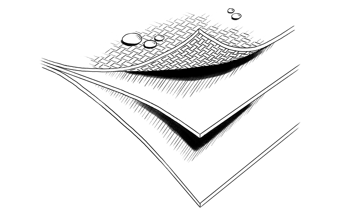 에코쉘은 비나 진눈깨비, 눈으로부터 보호하면서도 동시에 몸 안에 발생한 수분을 밖으로 내보내는 투습 기능을 갖추고 있습니다. 겉면에는 PFC 프리 발수 코팅(DWR)을 조합하여 발수기능을 구현하고, 그 안쪽으로는 친수성 막(hydrophilic membrane)을 삽입하여 비나 눈은 안쪽으로 침투하지 못하게 하면서 동시에 땀이나 몸 안에서 발생하는 수분은 바깥으로 내보내는 원리입니다.