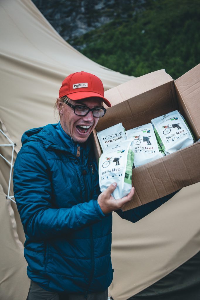Figure 1. 2017 피엘라벤 클래식 스웨덴에서 8kg 커피박스를 수송 받고는 즐거워하는 차드