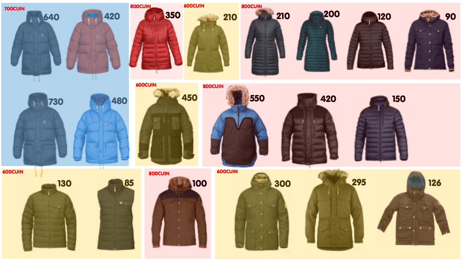 남성용과 여성용 익스페디션 다운 자켓의 현재 버전과 새로운 버전을 비교하면 CUIN은 똑같이 700이지만, 다운의 무게는 420g에서 730g까지 차이가 납니다.