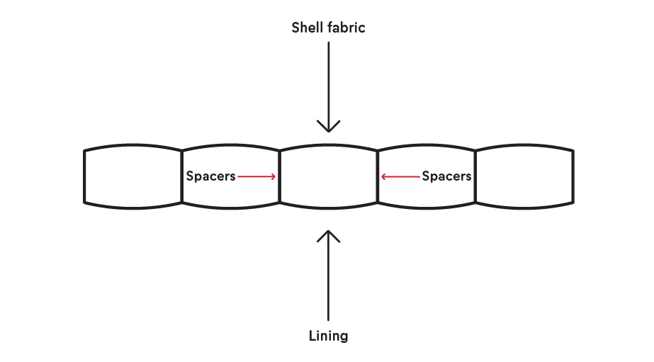 두번째 구조는 박스 구조입니다. 이 구조에서는 다운이 충전된 단과 단 사이에 메쉬 패브릭이 사용되어 냉점을 최소화합니다. 그러나 공정의 복잡성 때문에 가격이 올라가는 특징이 있습니다.