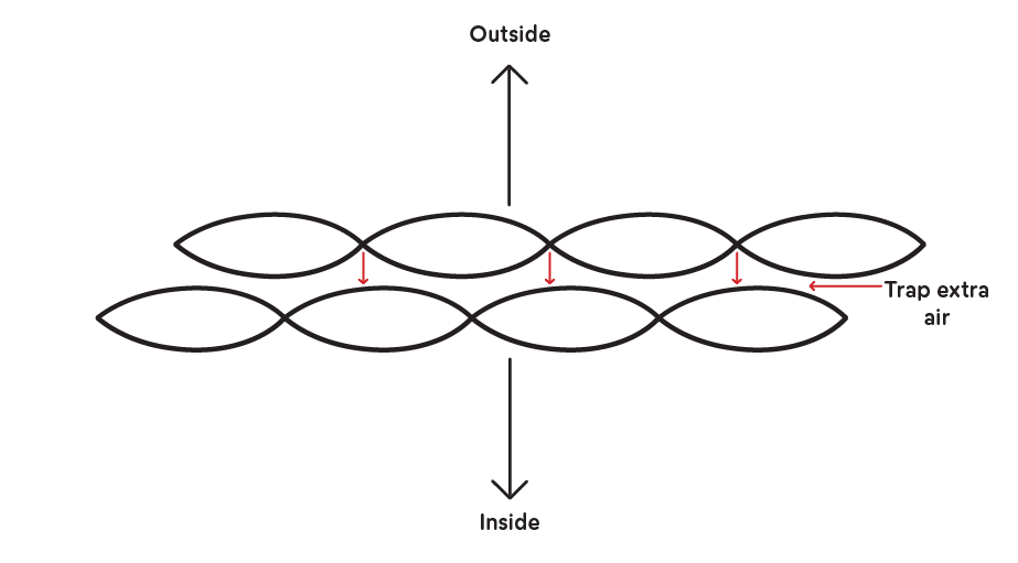 우리 피엘라벤에서 사용하는 마지막 기술은 오프셋 구조입니다. “우리는 sew-through 구조의 다운을 두 레이어로 겹쳐 봉제선이 엇갈리게 정렬합니다. 이렇게 하면 냉점이 사라질 뿐만이 아니라 다운 내부에는 물론 두 레이어 사이에도 공기가 추가적으로 가두어져 자켓의 보온력이 극대화되는 효과가 있습니다. 하지만 이 역시 공정의 복잡성 때문에 가격이 올라갑니다” 슈페이는 말합니다.