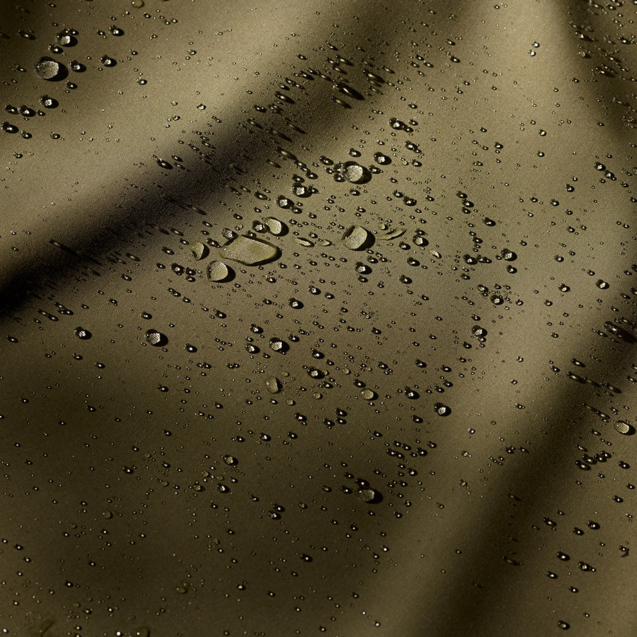 물로부터 가장 낮은 단계의 보호를 합니다. 만약 어떤 의류가 water resistant하다고 한다면, 이는 패브릭 자체가 비와 피부 사이의 장벽으로 작용한다는 의미입니다. 매우 타이트하고 촘촘하게 짜인 패브릭은 일정 정도 water resistant 한데, 이는 습기가 소재 안으로 스며드는데 시간이 걸리기 때문입니다. 그러나 추가적인 코팅작업을 한다면, 패브릭을 water repellent하게 만들 수 있습니다.