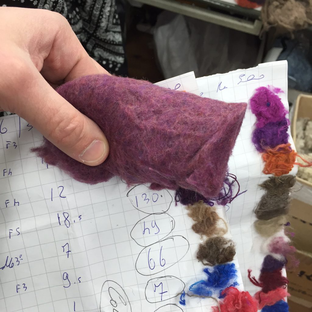 “재생될 울은 여러 출처로부터 수집됩니다”, 우리의 다른 디자이너 사라 이삭손은 설명합니다. “그 울은 스웨터를 만들고 남은 것일 수도, 방적 과정에서 남은 것일 수도, 혹은 정장을 만들고 남은 자투리일 수도 있습니다. 이 자투리 울은 색상 별로 전부 수집되어 잘게 조각납니다.”